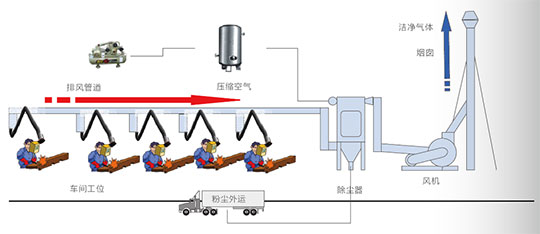 車間產生的煙塵由捕集裝置瞬間捕集收集后,經采用漸變管徑式(目的是平衡管路末端風速風量)的主管道進入除塵器,煙塵在除塵器內被高效凈化濾件阻截凈化,顆粒物在風機負壓作用下附著在濾件外側,脈沖閥在控制儀的控制下,每隔一定時間,自動對系統濾件由里至外進行反吹清灰,反吹過程中顆粒物落入灰斗內收集,灰斗內積累到一定量的顆粒物后,需要外運處理。在風機的作用下。凈化后的達標氣體由煙囪排出。